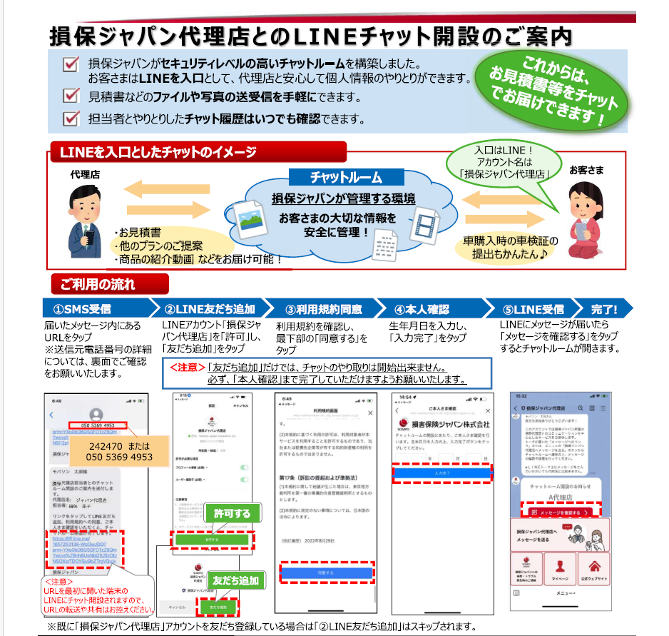お客さまはLINEを入口として、代理店と安心して個人情報のやりとりができます。
